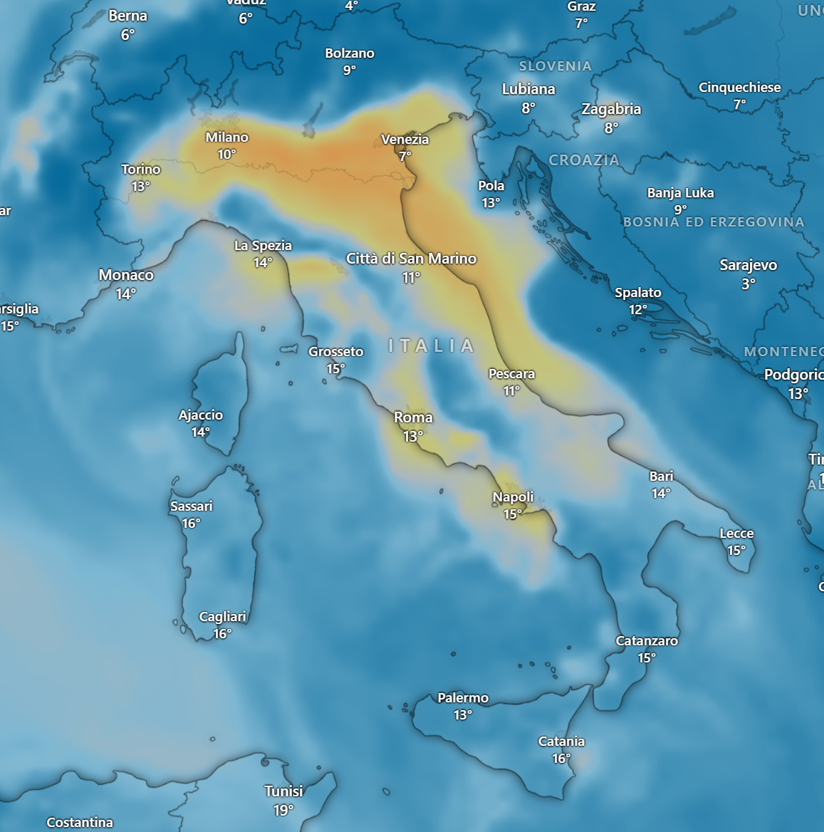 Nei prossimi giorni diminuiranno solo sulla pianura padana a causa della schermatura dei raggi solari provocata dalle nebbie.