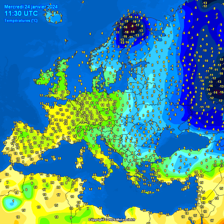 Nell’elaborato delle temperature di oggi si evince come sull’Europa centro occidentale e l’Italia, sono di molto superiori alle medie stagionali: