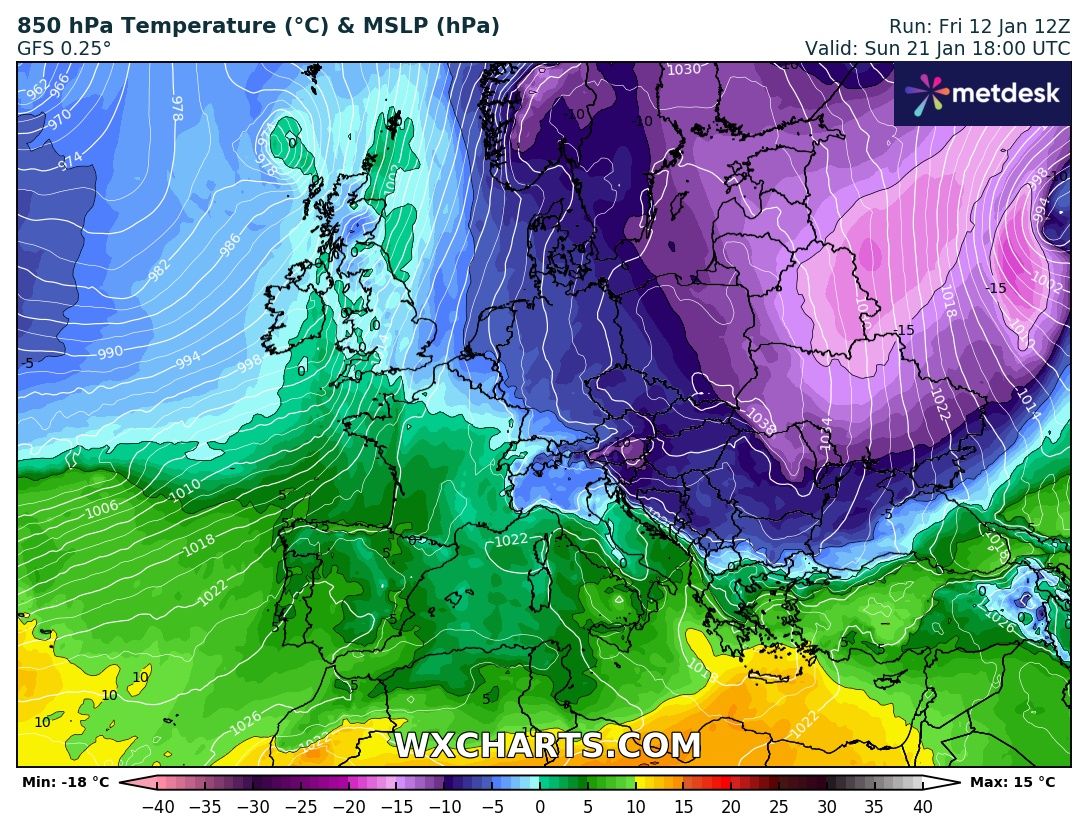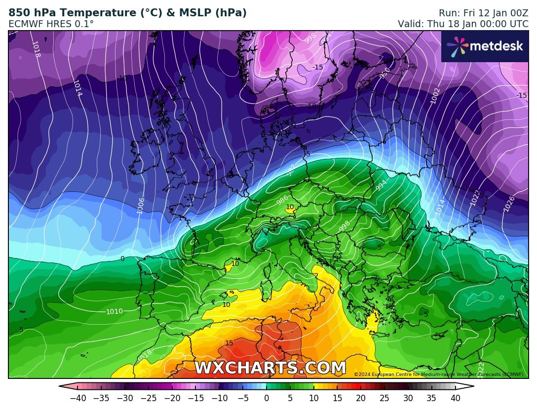Anche qui la tendenza segue il collega Americano, con l’espansione dell’Anticiclone Africano verso l’Italia, portando stabilità ed aria calda, oltre a nebbie in val padana con un rialzo delle temperature più contenuto, mentre il suo apice viene anticipato a Giovedì 18 Gennaio: