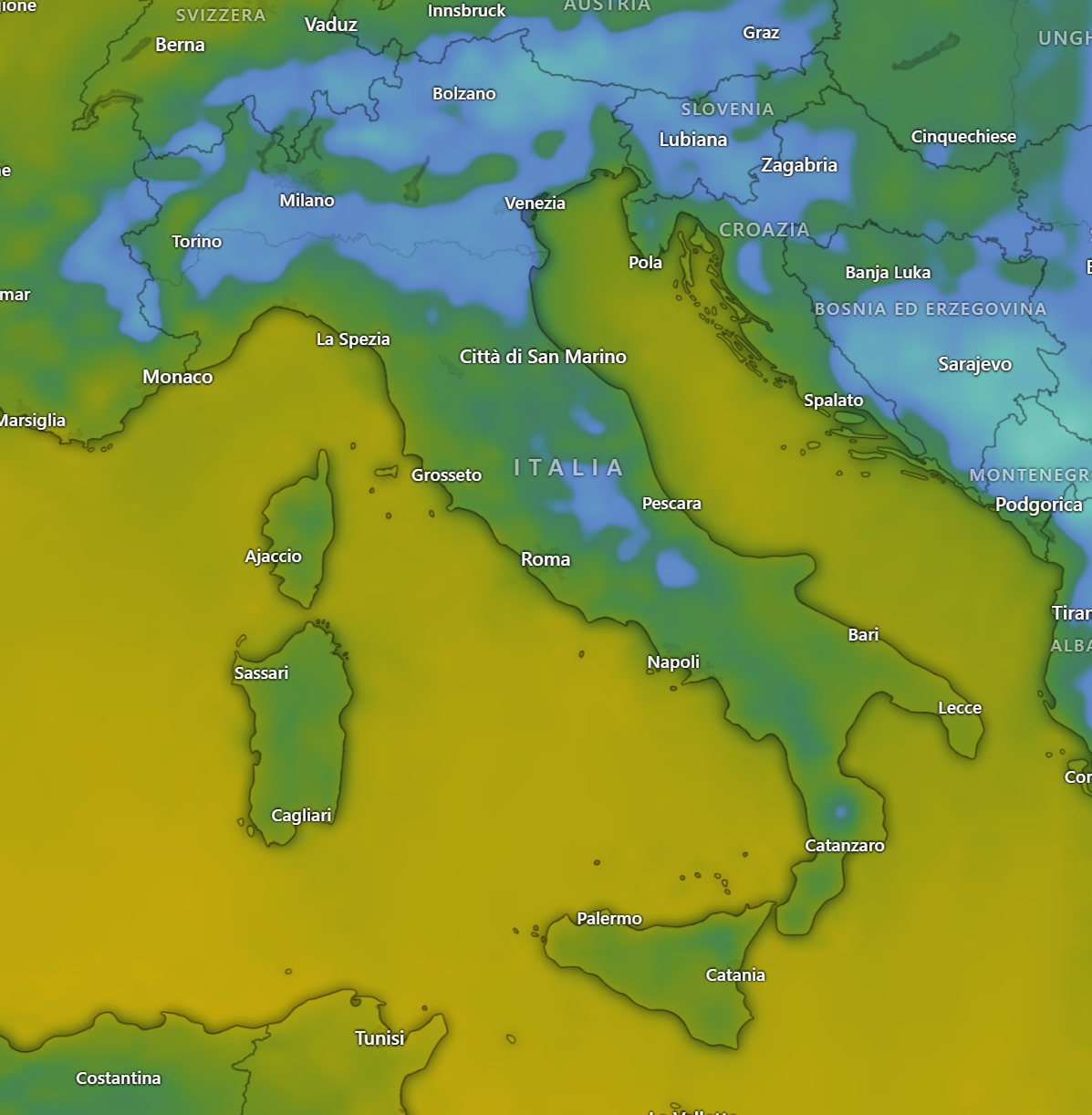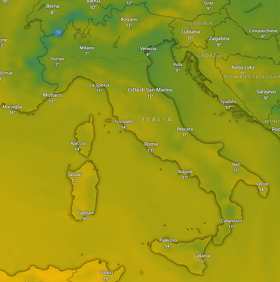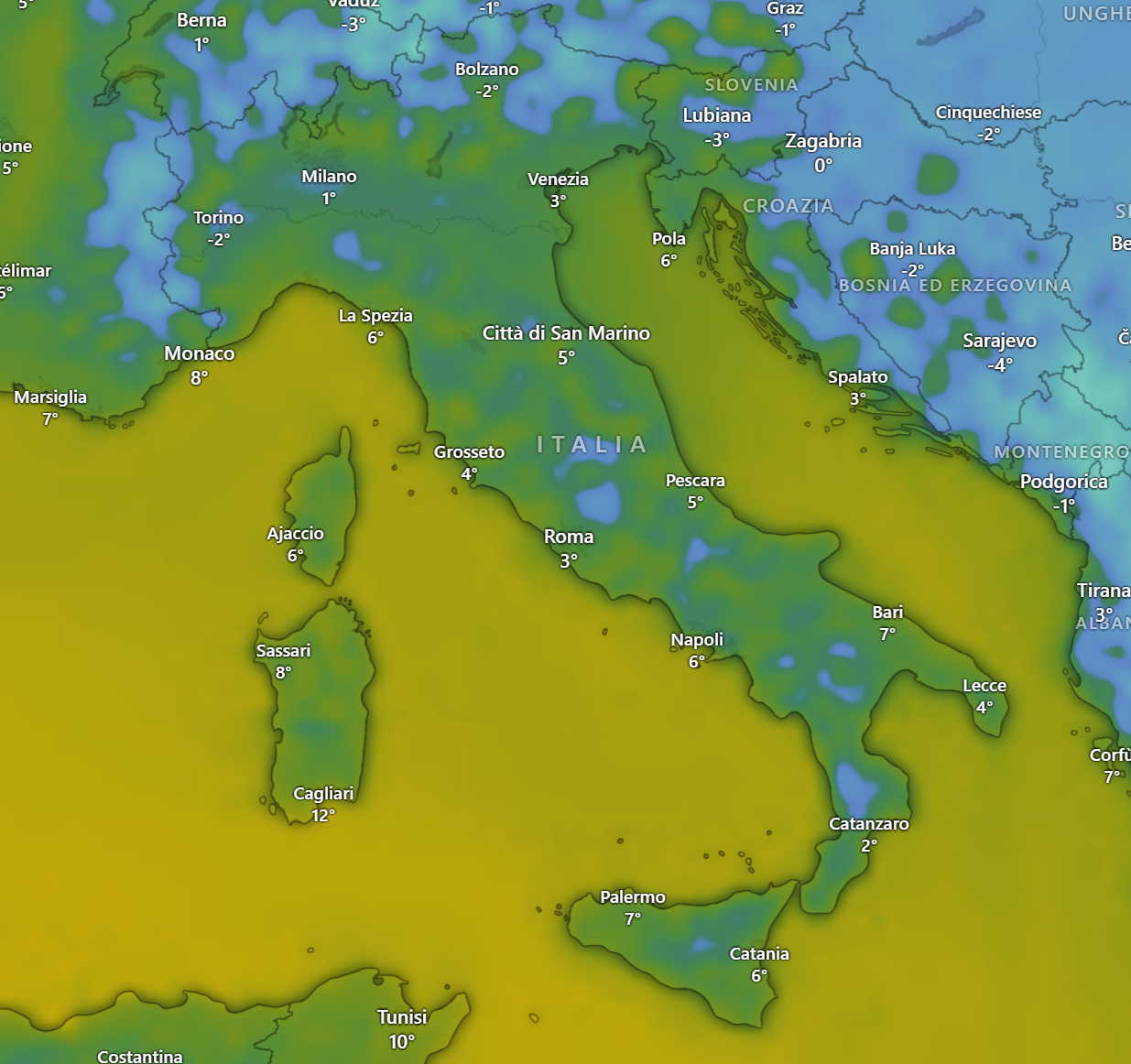 Al nord le temperature rimarranno su valori relativamente bassi a causa della minor irradiazione solare dovuta alle nebbie specie in val padana, mentre sulle Alpi l’inversione termica aumenterà di vari gradi le temperature portandole tutte su valori sopra lo zero anche in quota: