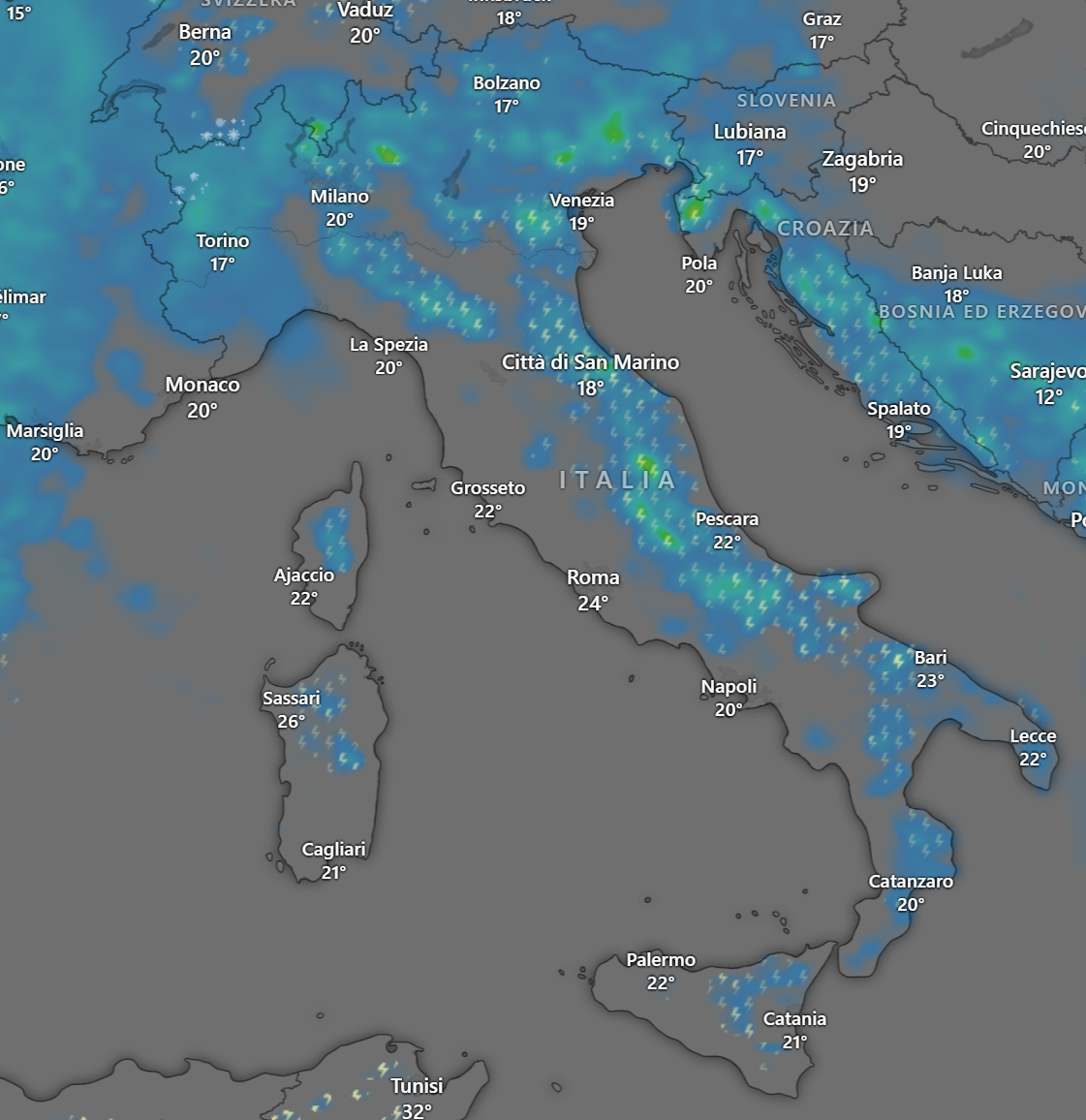 Nell’elaborato previsto per il pomeriggio di Martedì 14 Maggio, le piogge saranno presenti al Nord, mentre dei temporali si attiveranno sull’Emilia Romagna orientale oltre che sulla dorsale Appenninica: