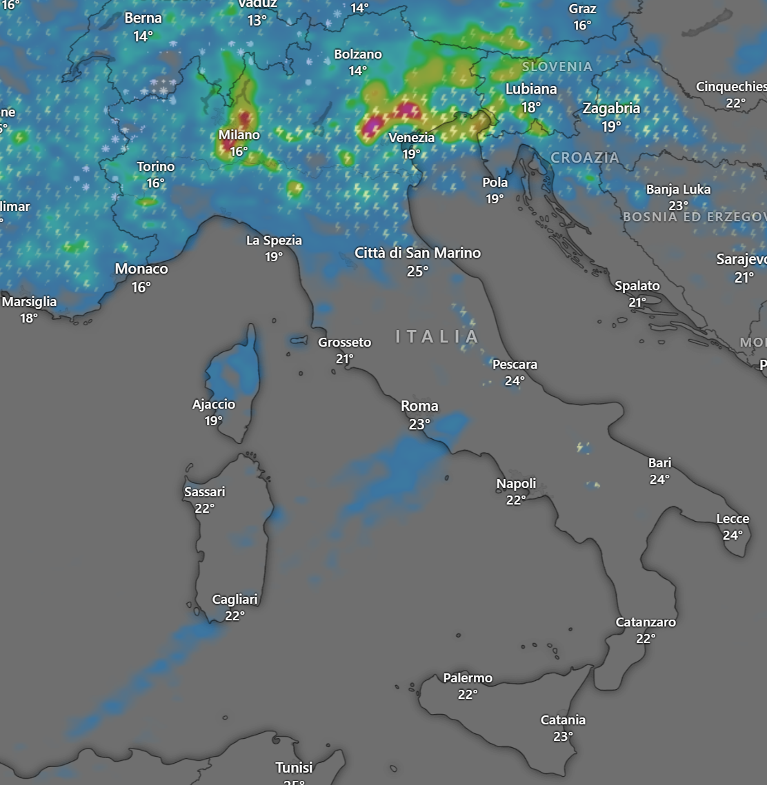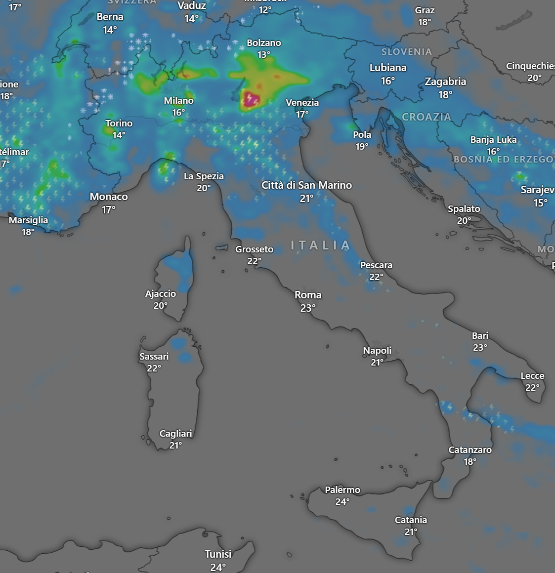 Anche Giovedì 16 Maggio, continuerà il tempo instabile a tratti perturbato al Nord con forti piogge temporali: