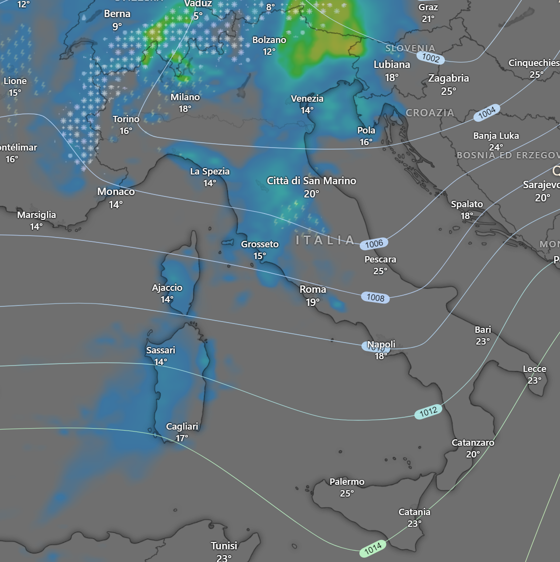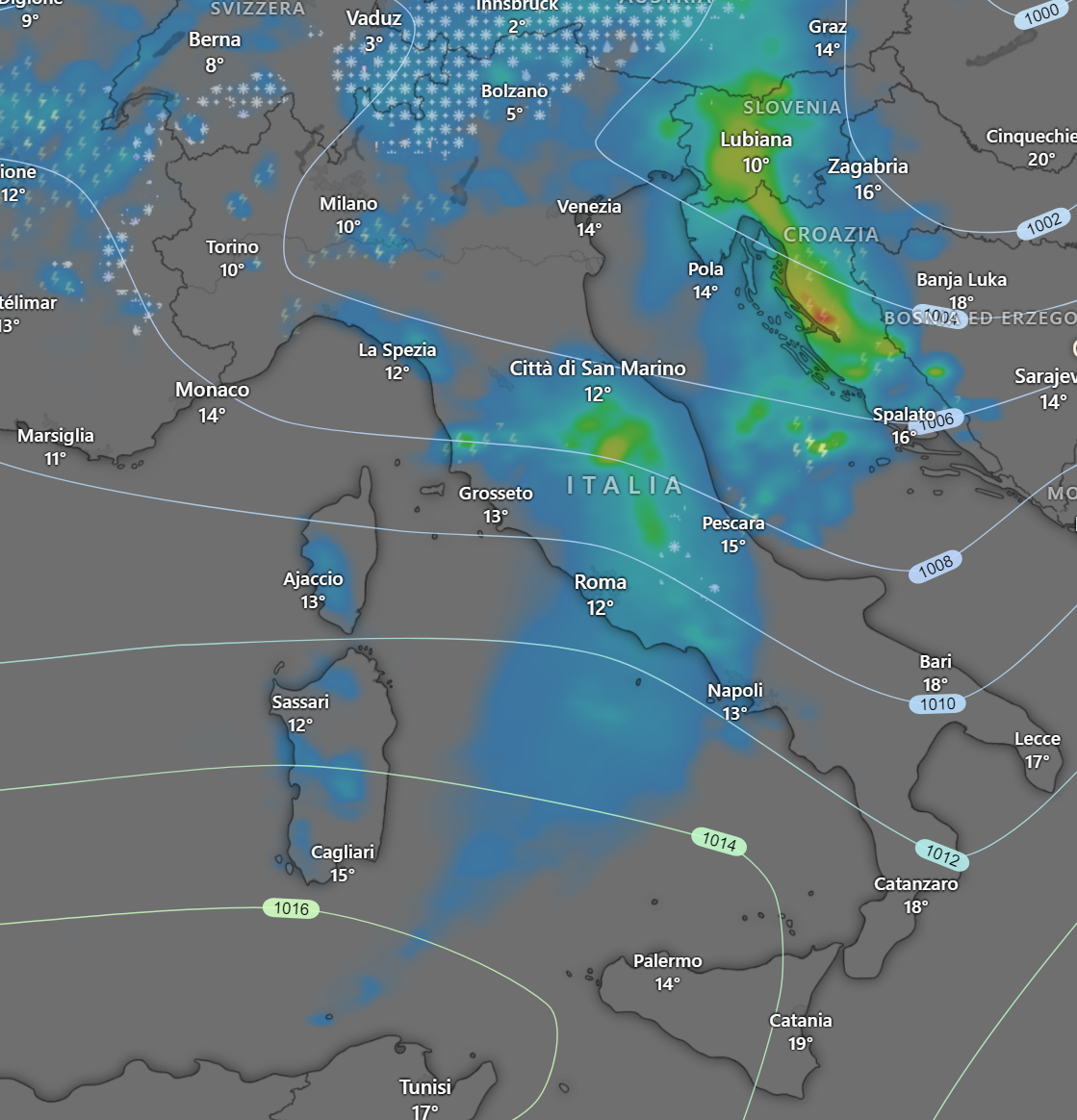 Entro le 19 i fenomeni si concentreranno al Centro Italia, sul Triveneto, la Campania e Sardegna, con nevicate sulle Alpi Centrali e isolati temporali al Nord Ovest.
