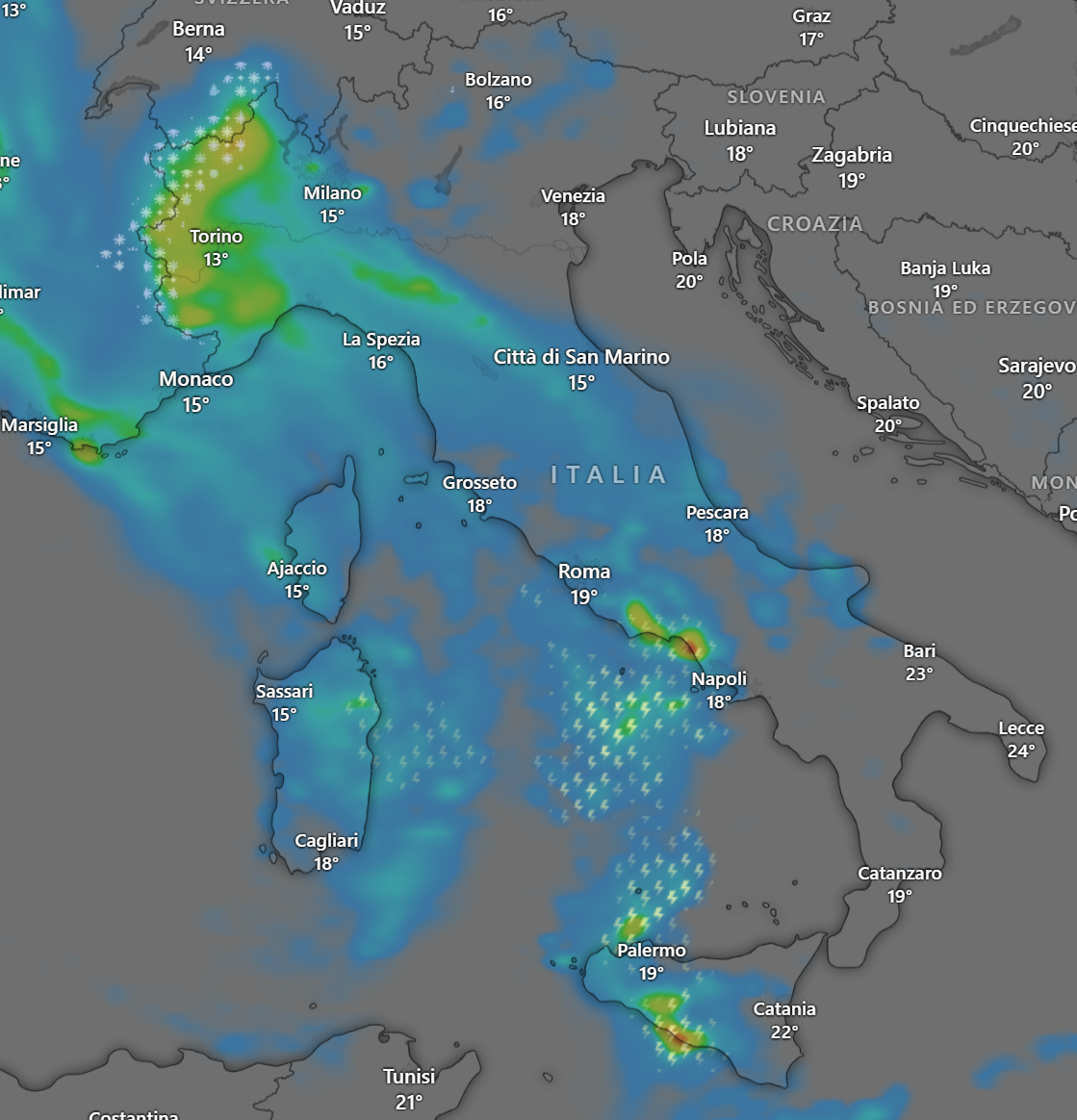 Nella mattinata le piogge avranno raggiunto il Nord Ovest, il Centro e le Isole maggiori, con temporali sulla Sicilia e la Campania, oltre a nevicate sulle Alpi occidentali a quote medio alte.