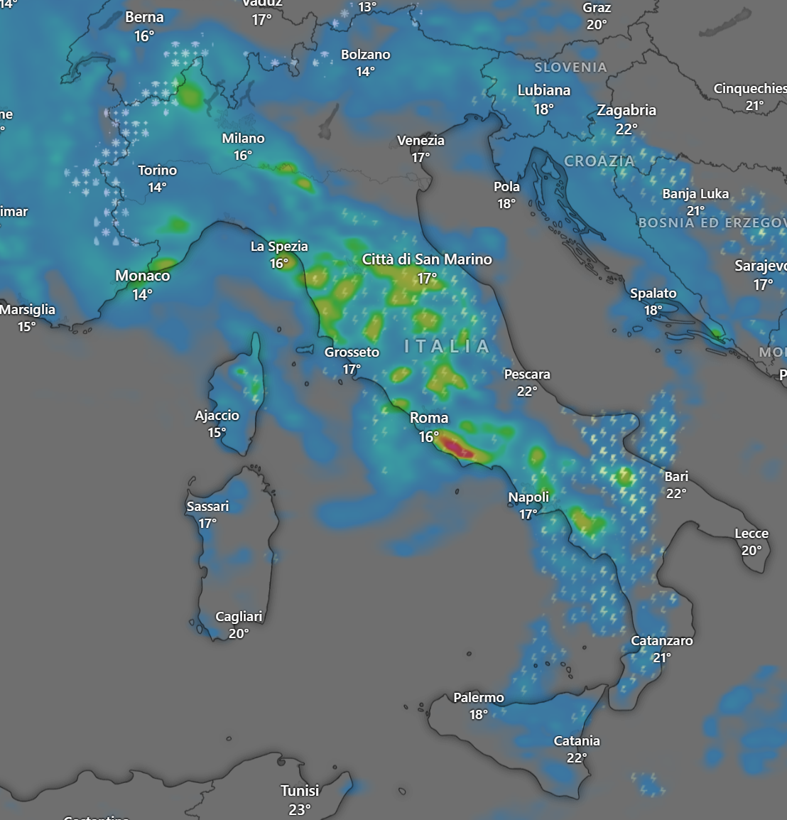 Nell’elaborato le precipitazioni previste alle 16 del pomeriggio: