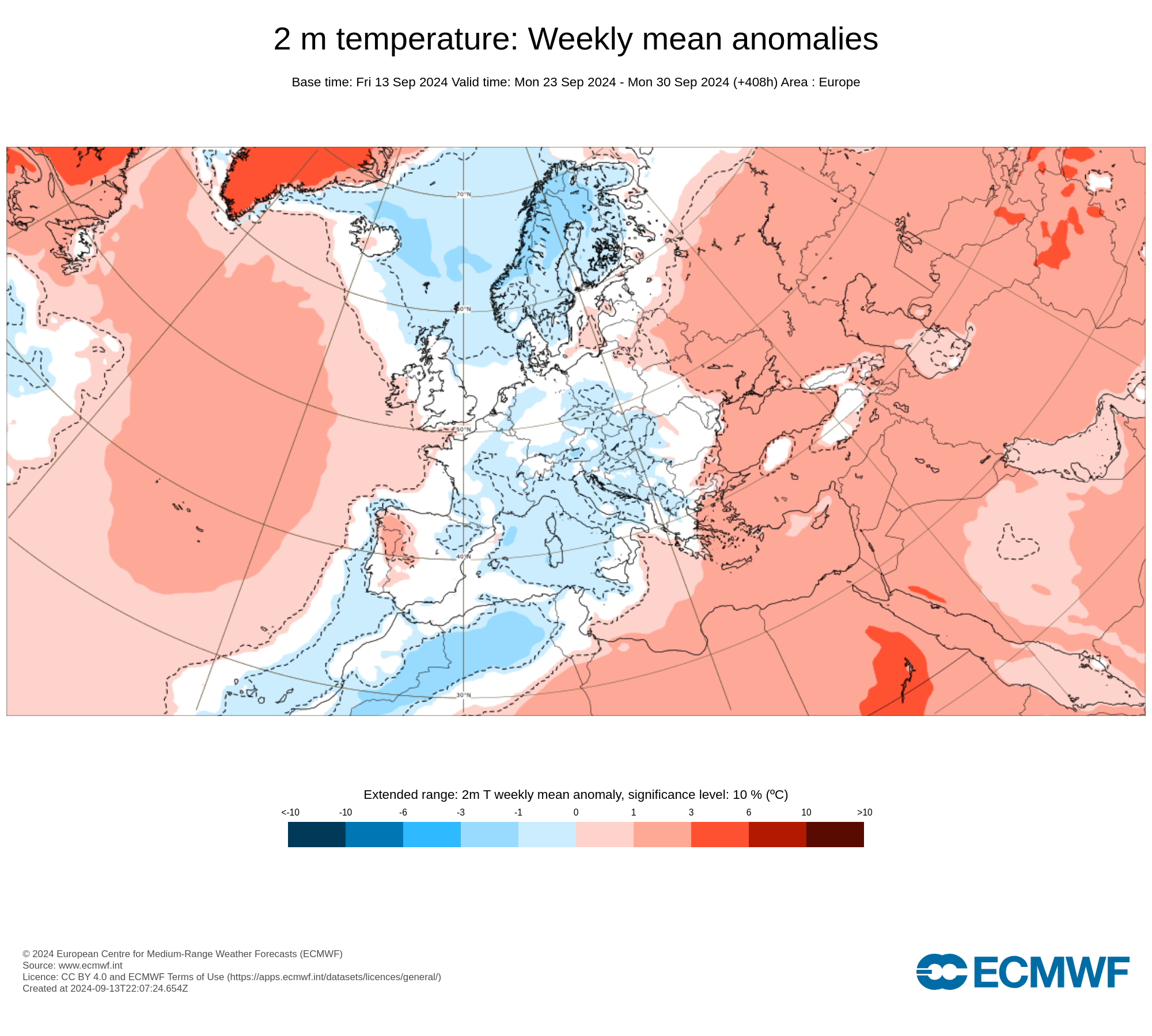 Nella terza decade di Settembre 2024, le temperature dovrebbero essere ancora al di sotto della media al Centro Nord e sulla Sardegna, mentre al Sud e sulla Sicilia sono previste in linea con la media del periodo (clicca per ingrandire):