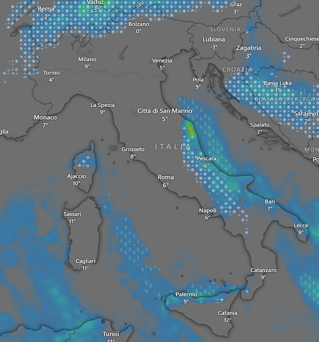 La neve raggiungerà l’Appennino a quote molto basse sui rilievi Marchigiani, Abruzzesi e Campani ed in alcuni casi la neve o pioggia mista a neve, potrebbe raggiungere le zone di pianure limitrofe alle colline (da confermare)