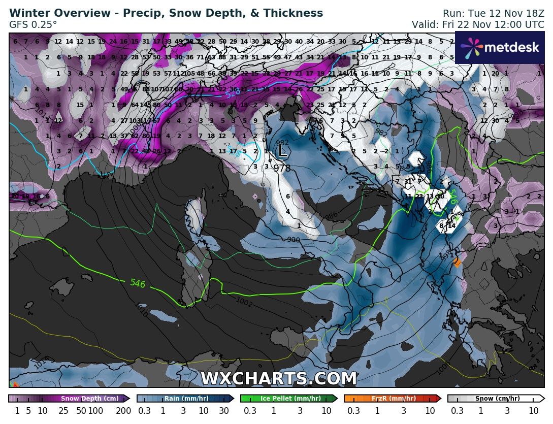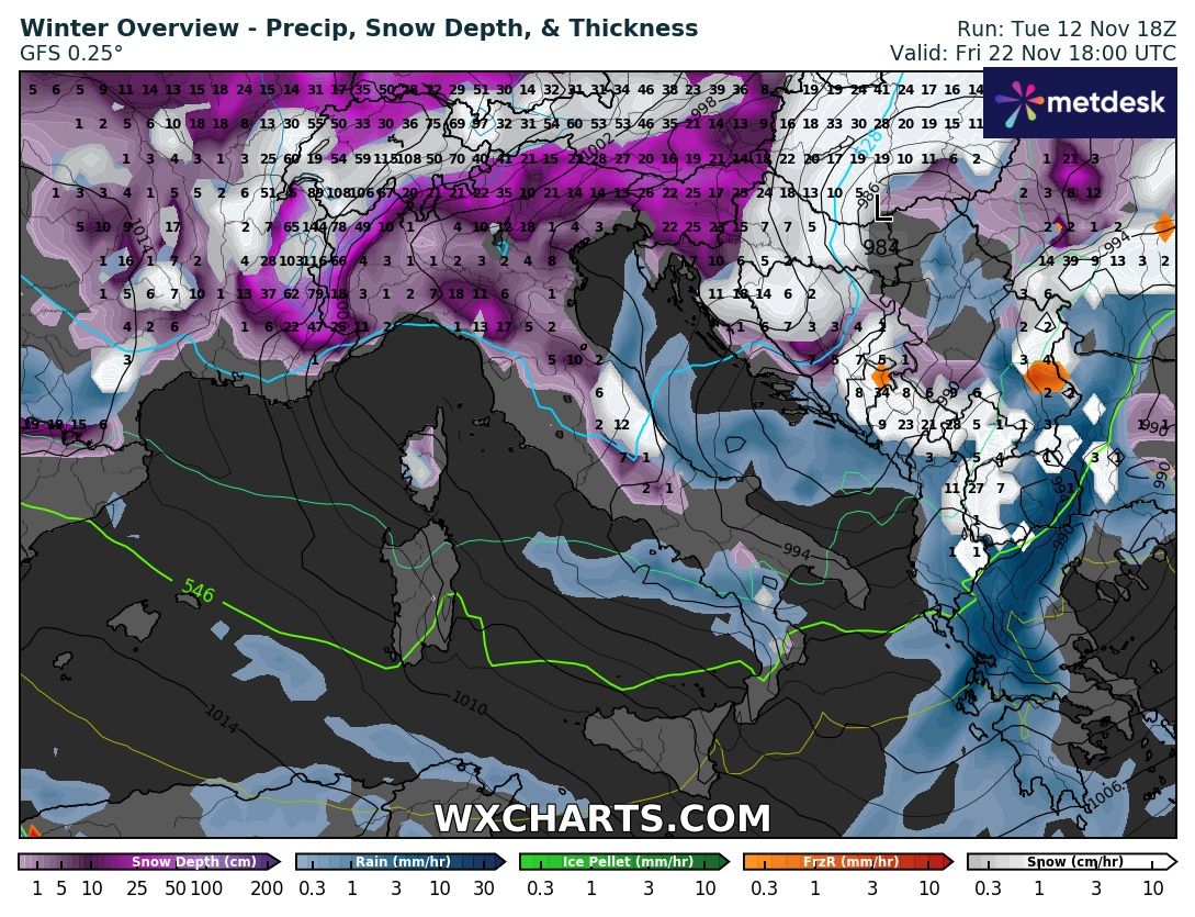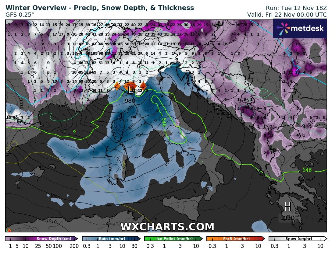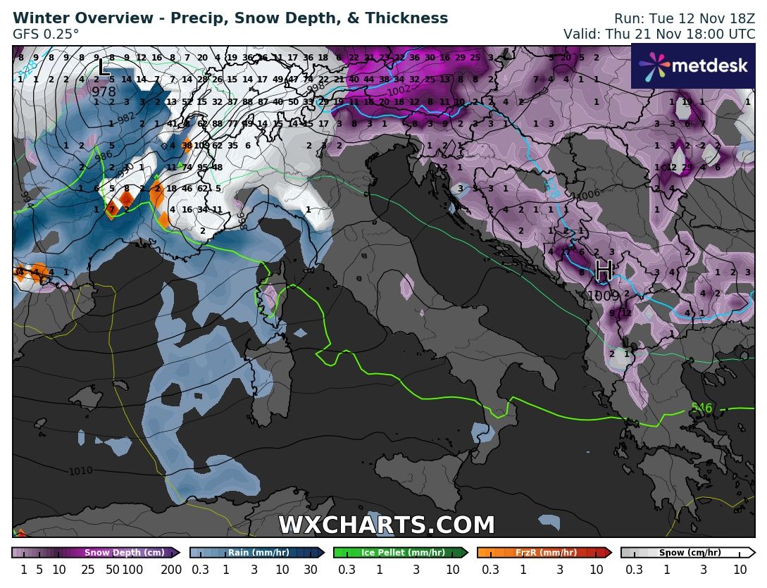 Nell’elaborato grafico previsto per Giovedì 21 Novembre già nel tardo pomeriggio tutto il Nord ovest potrebbe essere interessato da nevicate sia sulle Alpi che sulle pianure (clicca per ingrandire):
