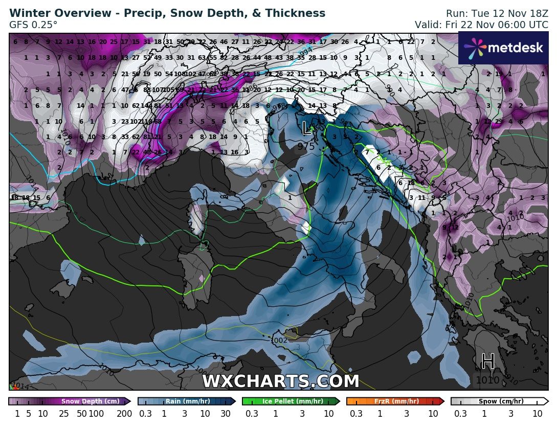 L’arrivo in concomitanza di un’intensa perturbazione dispenserà intense piogge su tutto il Paese e nevicate a quote molto basse sulle Alpi e l’Appennino Centro settentrionale.