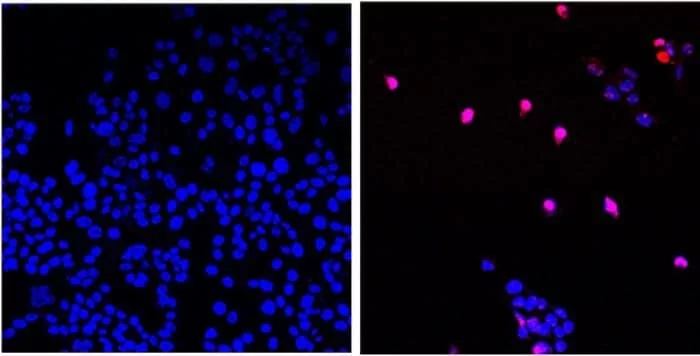 A sinistra cellule tumorali non trattate, a destra le cellule morenti (in viola) dopo il trattamento con AOH1996. Credit: City of Hope