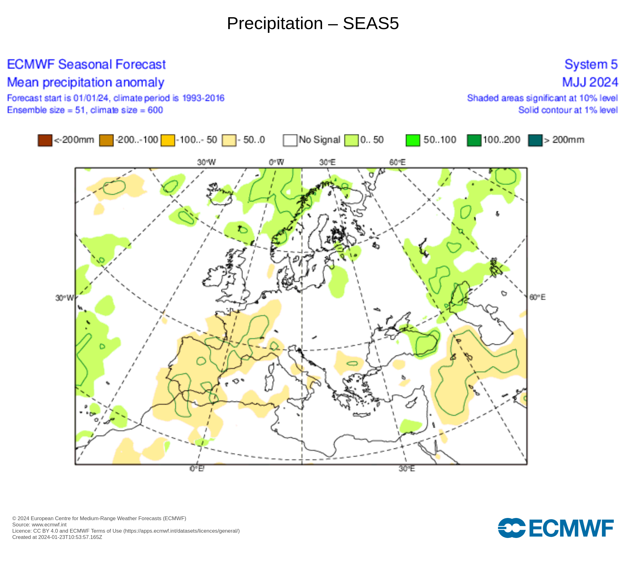 Per quanto riguarda le precipitazioni il range varia da quelle oltre la media, da zero fino a 200 litri di acqua per metro quadro e viceversa sotto la media da zero a 200 litri di acqua per metro quadro.