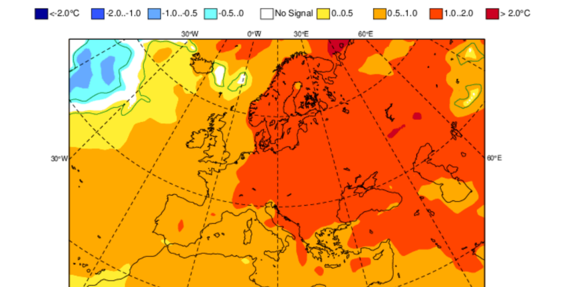 Sembrerebbero rientrare i valori da un grado oltre la media a mezzo grado, su tutta l’Europa del Nord e parte del Mediterraneo.