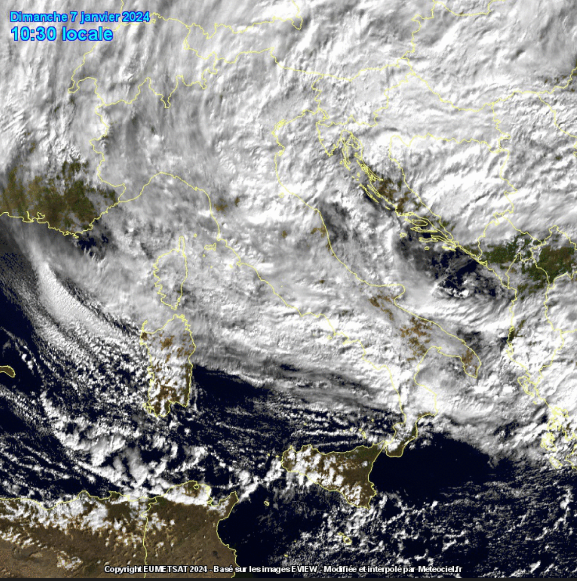 Il ciclone attualmente è posizionato sul medio basso Adriatico con una pressione di 990 hPa e venti a rotazione ciclonica, mentre una compatta copertura nuvolosa è presente su tutti i settori del nostro Paese: