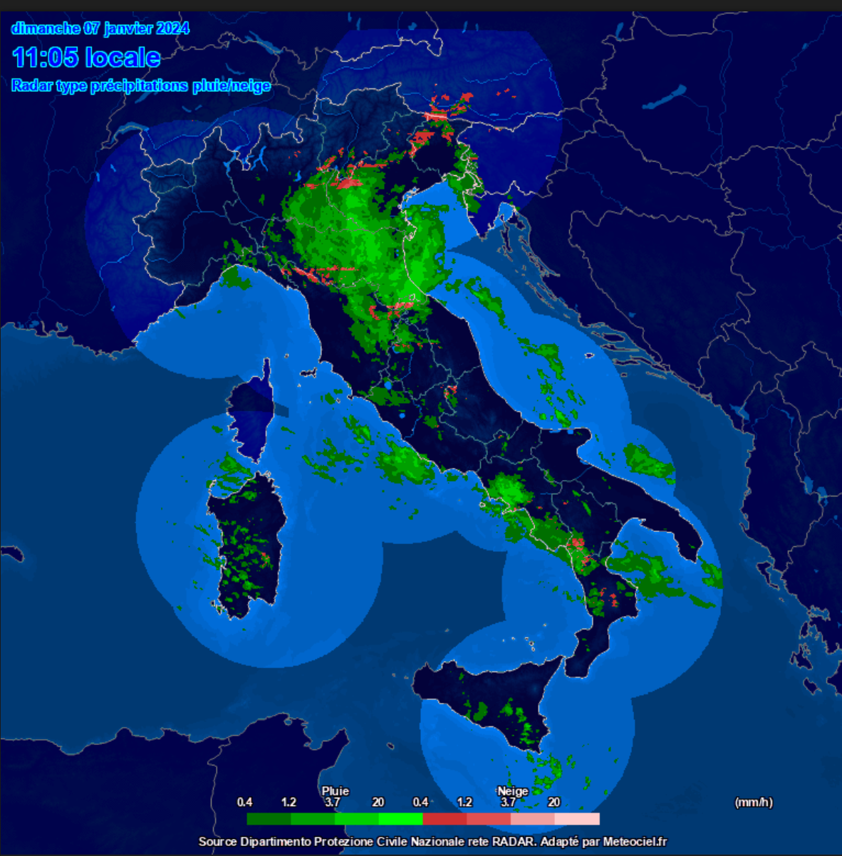 Il radar delle precipitazioni vede piogge su Liguria, Toscana, Umbria, Marche, Campania, Calabria, Sicilia e Sardegna, oltre a piogge intense su Emilia Romagna e Veneto.