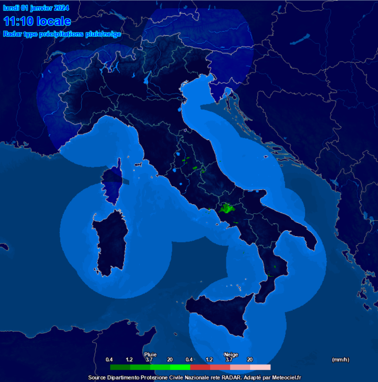 Per quanto riguarda le precipitazioni troviamo delle piogge sparse su Umbria, Lazio, Campania e Calabria, di seguito l’immagine del radar:
