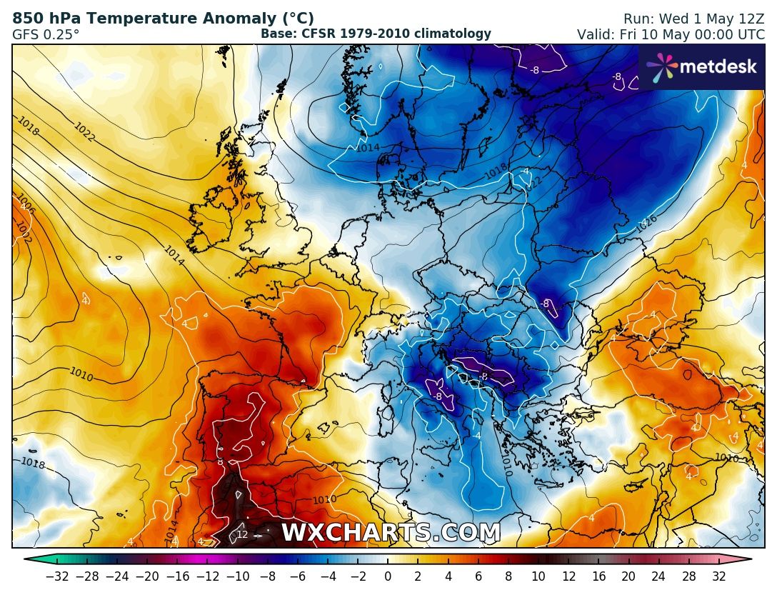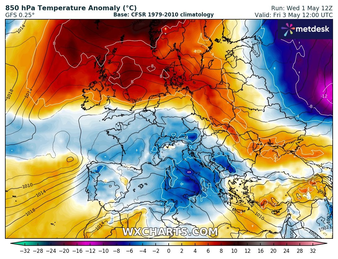 Venerdì 10 maggio tutta l’Italia, dovrebbe essere inglobata da un nucleo di aria fredda per la stagione, proveniente dalle Repubbliche Baltiche, con temperature al di sotto di 12 gradi rispetto alla media stagionale: