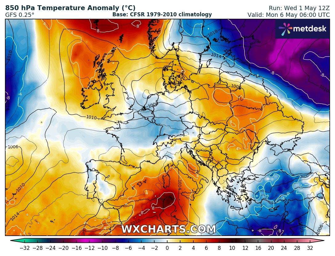 Lunedì 6 Maggio un’ansa dell’Anticiclone Africano dovrebbe abbracciare il Mediterraneo ed il Centro Sud, oltre le Isole maggiori, facendo aumentare le temperature di almeno 5 gradi sopra le medie stagionali:
