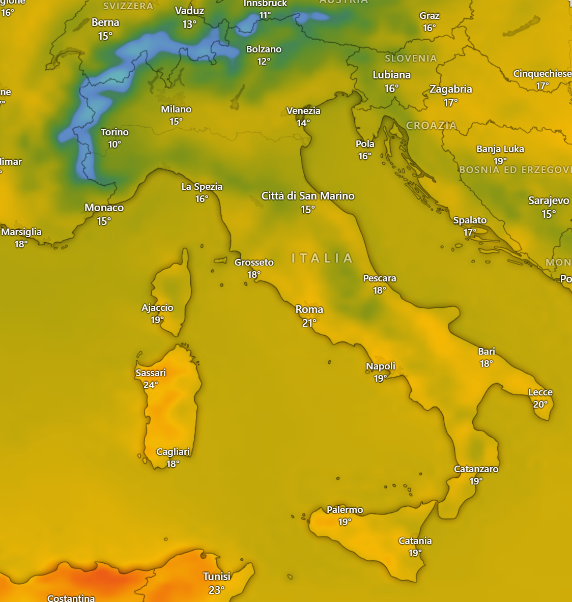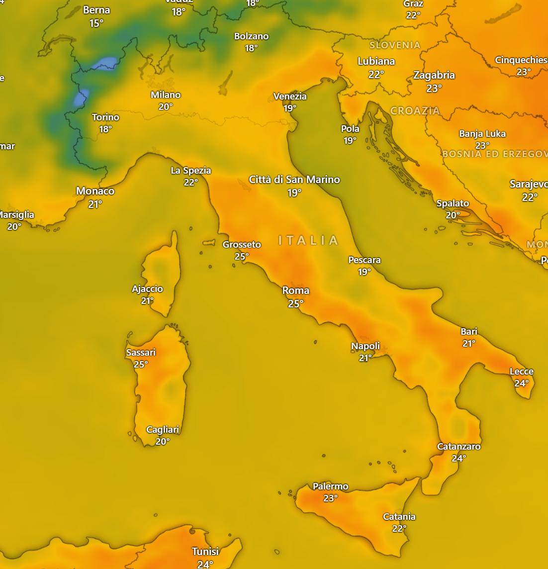 Lunedì 29 Aprile continua il rialzo termico con temperature al Nord comprese tra i 18 ed i 22°, mentre sul resto del territorio saranno comprese tra i 19 e 25° con punte fino a 28°: