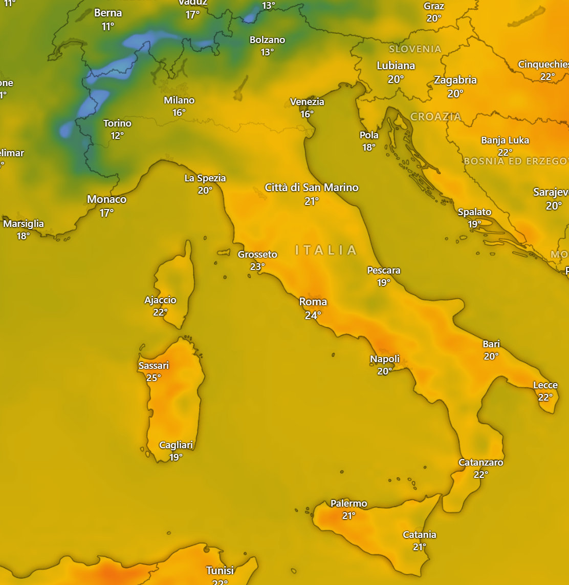 Le massime previste per Domenica 28 Aprile al Centro Sud e sulle Isole maggiori saranno comprese tra i 19 ed i 24° con punte fino a 27°, mentre al Nord saranno ancora comprese tra i 12 ed i 16°: