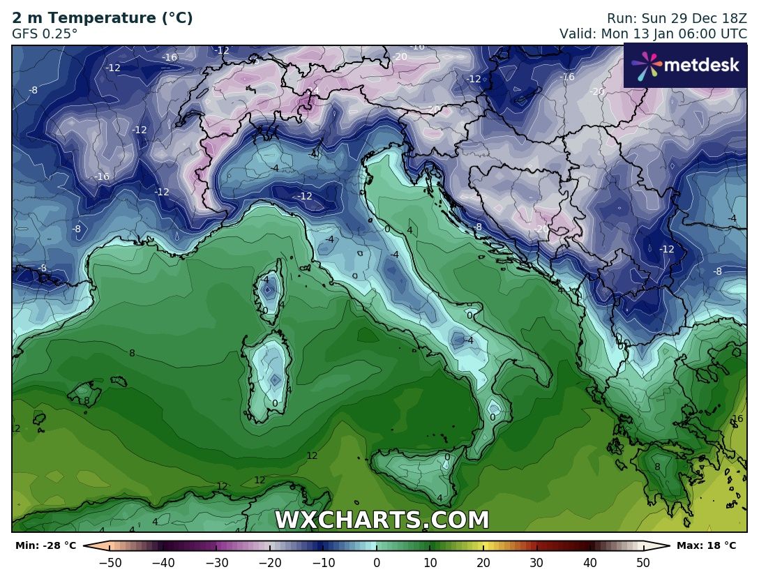 Nelle ore successive si dovrebbe avere un ulteriore calo termico, per l’aria gelida proveniente dalle steppe Siberiane ed una temperatura di -28° alla quota di 850 hPa (circa 1500 metri d’altezza) a causa l’aria estremamente fredda ed i valori dovrebbero raggiungere fino a 15° al di sotto della media del periodo.