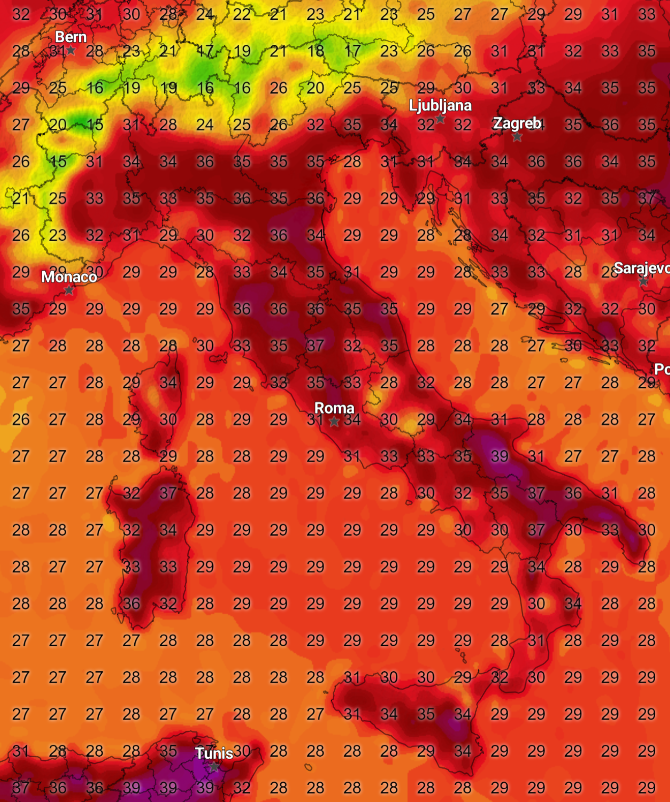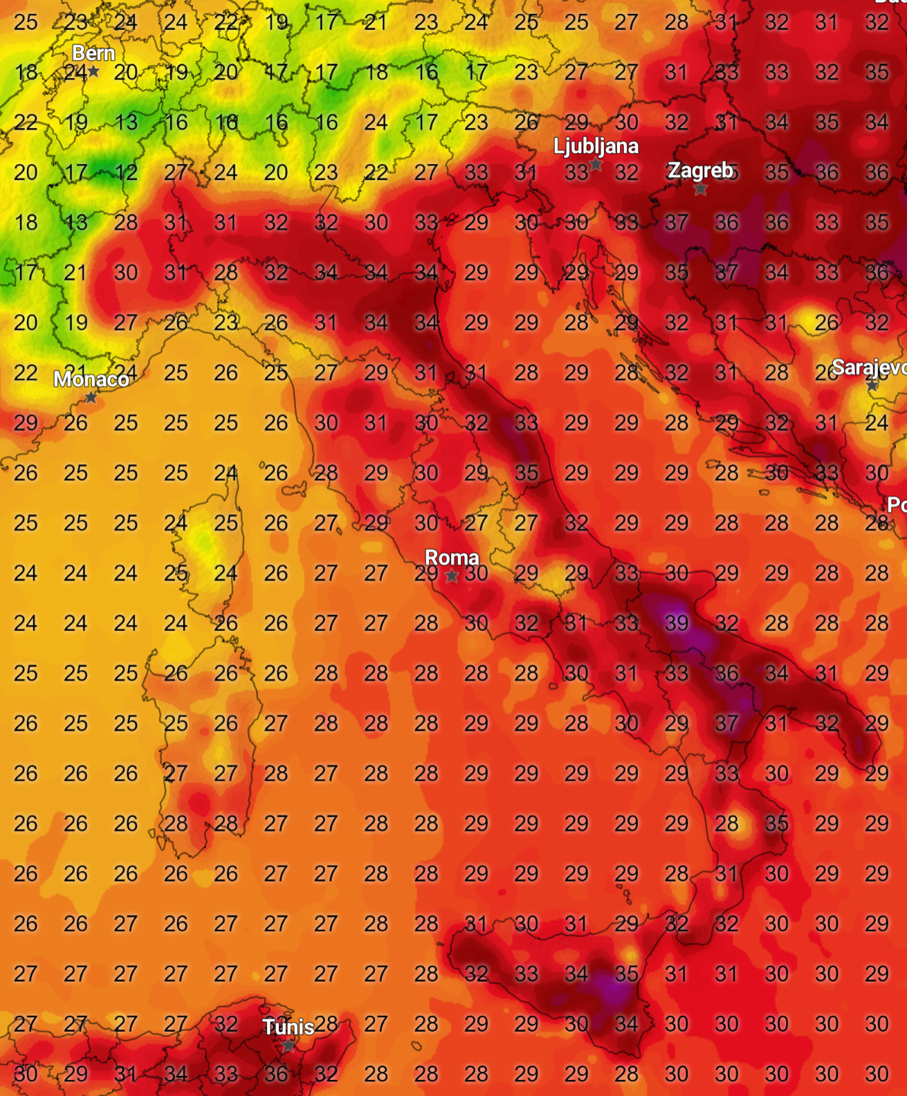 Il picco massimo del caldo si raggiungerà nella giornata di Martedì 13 Agosto, con temperature massime su tutto il Paese comprese tra i 33 ed i 37° con punte fino a 40° sulla Puglia.