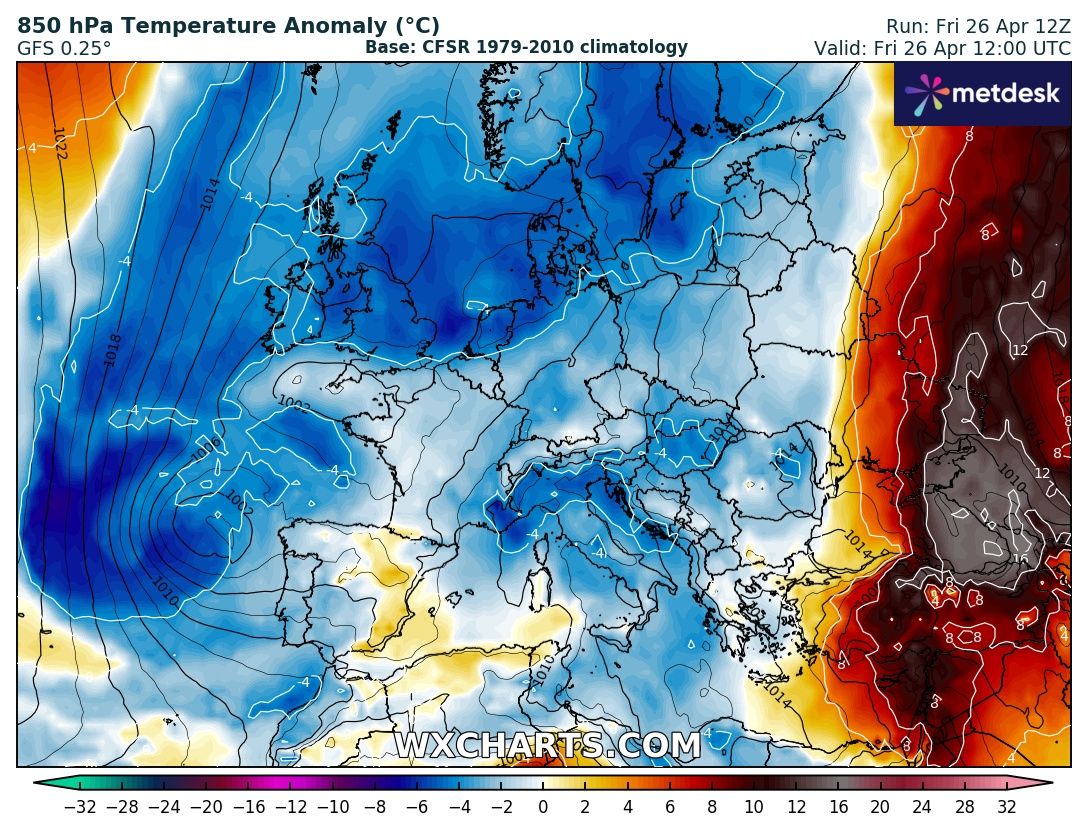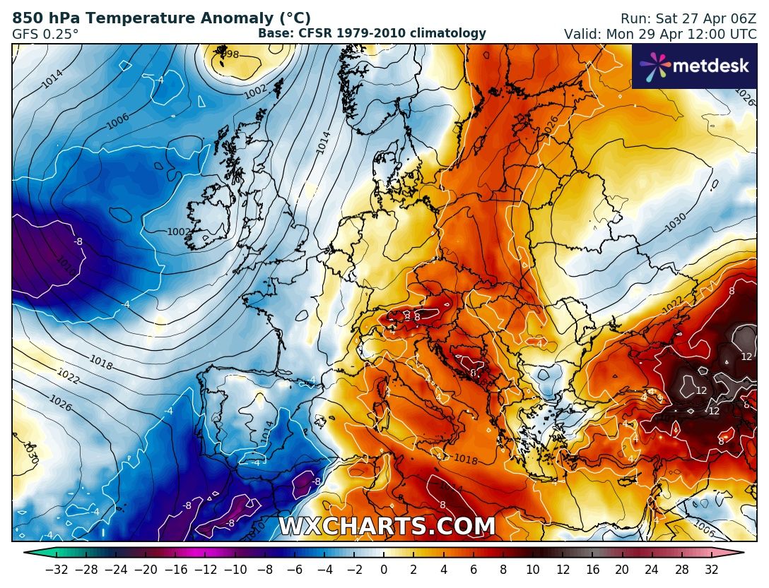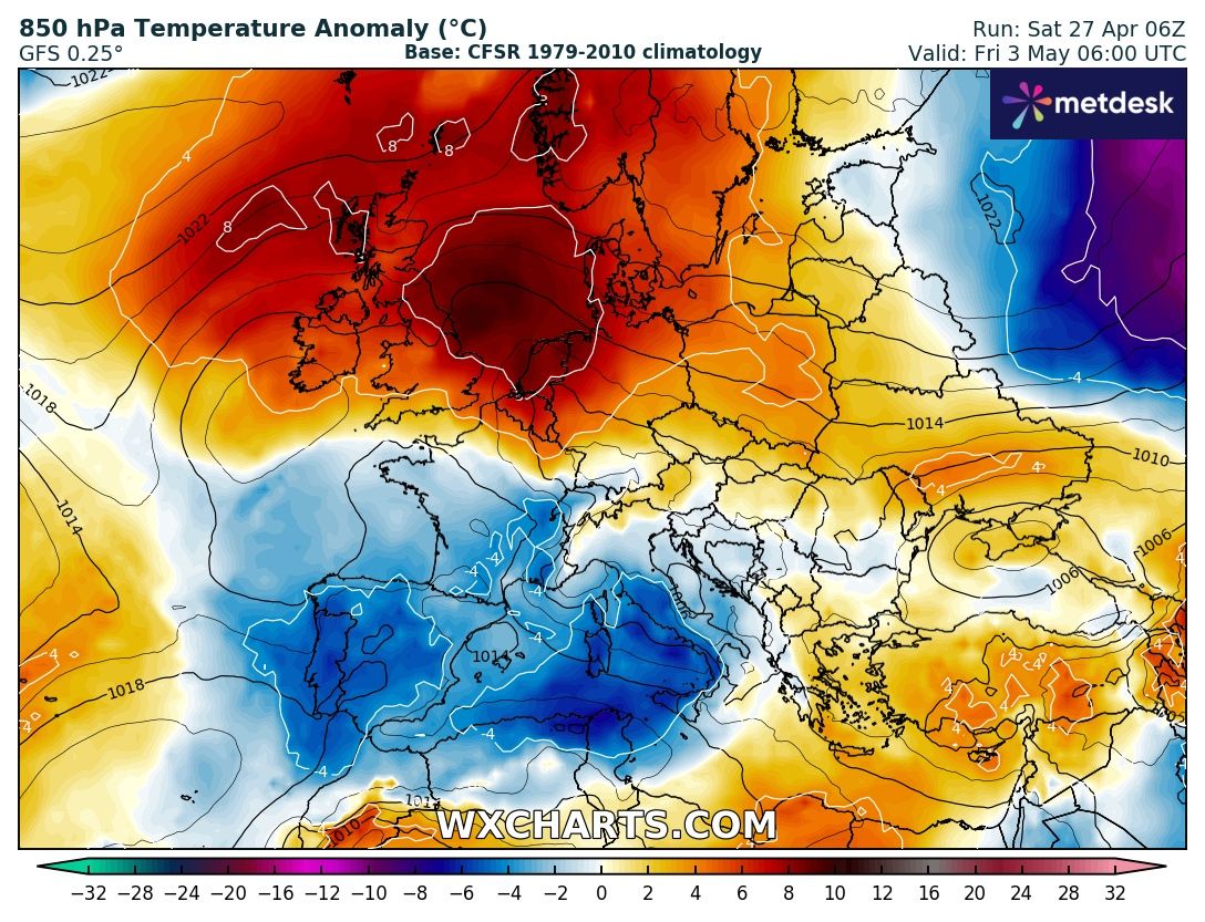 Una saccatura nella giornata di Domenica 28 Aprile, approderà sul Nord Africa, attivando l’Anticiclone Africano che si erigerà fino alle Repubbliche Baltiche, riportando le temperature sull’Italia ed il Centro Europa al di sopra delle medie stagionali.